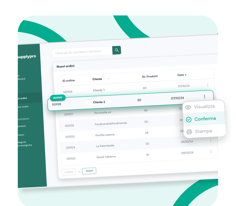 Ricevi, conferma e gestisci rapidamente tutti gli ordini in arrivo dai tuoi clienti di fiducia. Un sistema consolidato, per evitare ordini sbagliati ed ottimizzare l'interazione con i tuoi clienti.